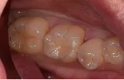 診断の結果をもとに、保険診療適用の白いプラスチックの被せ物「CAD/CAMインレー」、金属を使う「メタルインレー」。そして、ガラス系セラミックe-maxを用いた被せ物「e-maxインレー」を提案いたしました。患者様は審美性がいいこと、プラークが付きにくいこと、より強い接着剤を使用できること。以上の観点から、 e-maxインレーを選択されました。 |