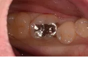 | 診断結果 | 拝見したところ、視診で以前詰めた金属(インレー)の下にむし歯がありそうでした。そこで、レントゲン撮影し、確認したところ、金属インレーの下にむし歯(2次カリエス)が確認されました。